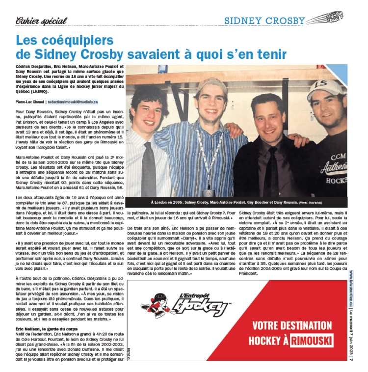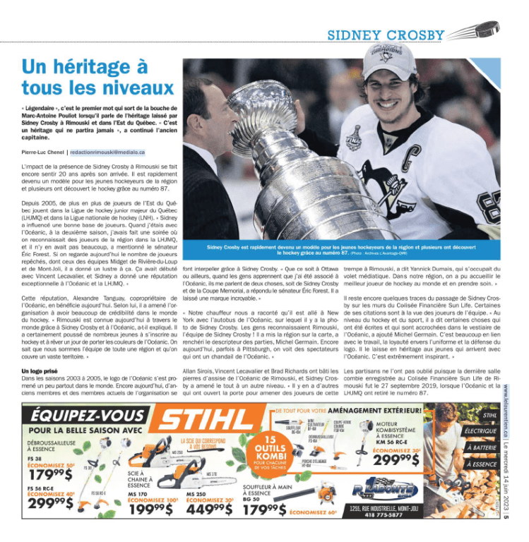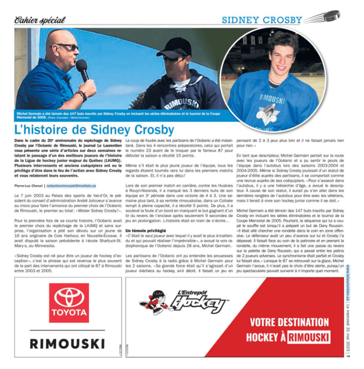 Vingt ans plus tard, quel est l’héritage laissé par Sidney Crosby à Rimouski et dans l’Est-du-Québec? Dans cette série d’articles pour Le Laurentien de Rimouski, plusieurs intervenants racontent comment ils ont vécu les saisons 2003-2004 et 2004-2005. De plus, j’ai eu le privilège de m’entretenir avec Sidney Crosby pour un des articles.